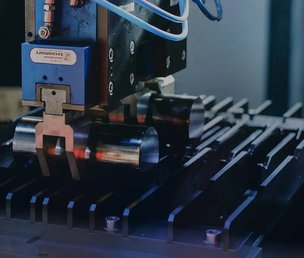 Sistema di scarico pezzi con robot antropomorfo e cambio contenitore automatizzato (4 contenitori); macchina di misura automatica per il controllo di lunghezza e perpendicolarità dei pezzi prodotti.