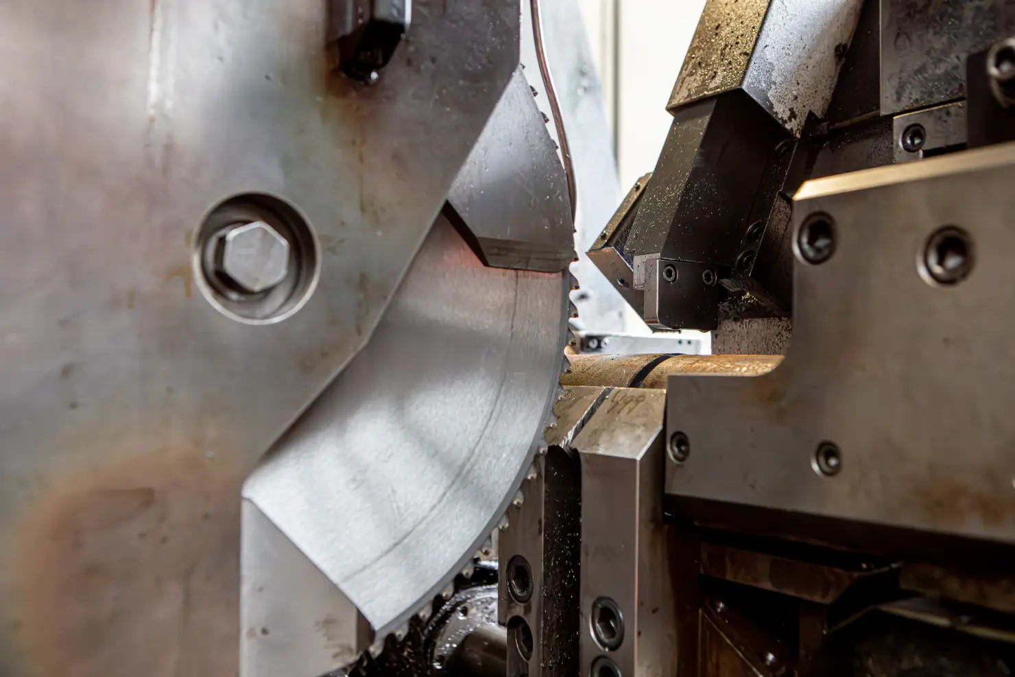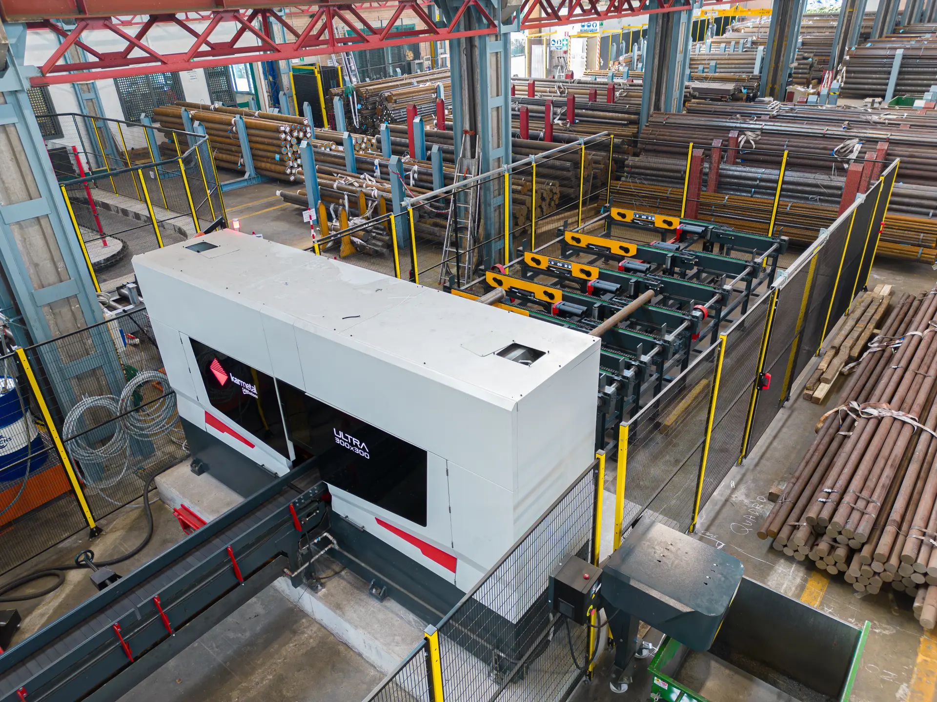 L’area di taglio è dotata di 5 segatrici a disco e due segatrici a nastro. Alcune segatrici sono dotate di sistema di scarico pezzi con robot antropomorfo, cambio contenitore automatizzato, smussatrice, centro-intestatrice, misurazione automatica di lunghezza e perpendicolarità.